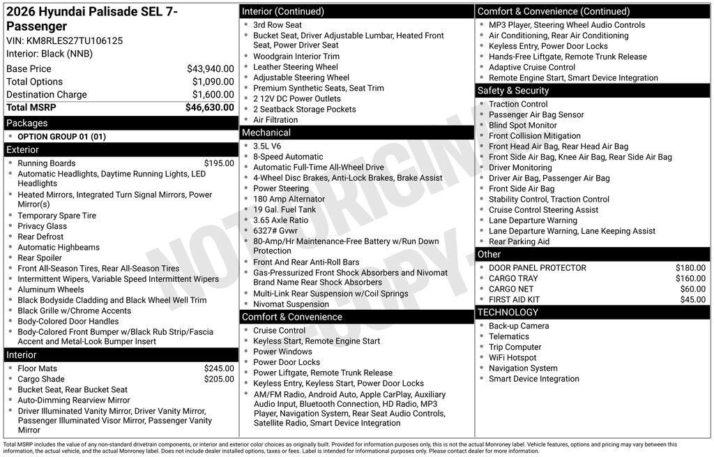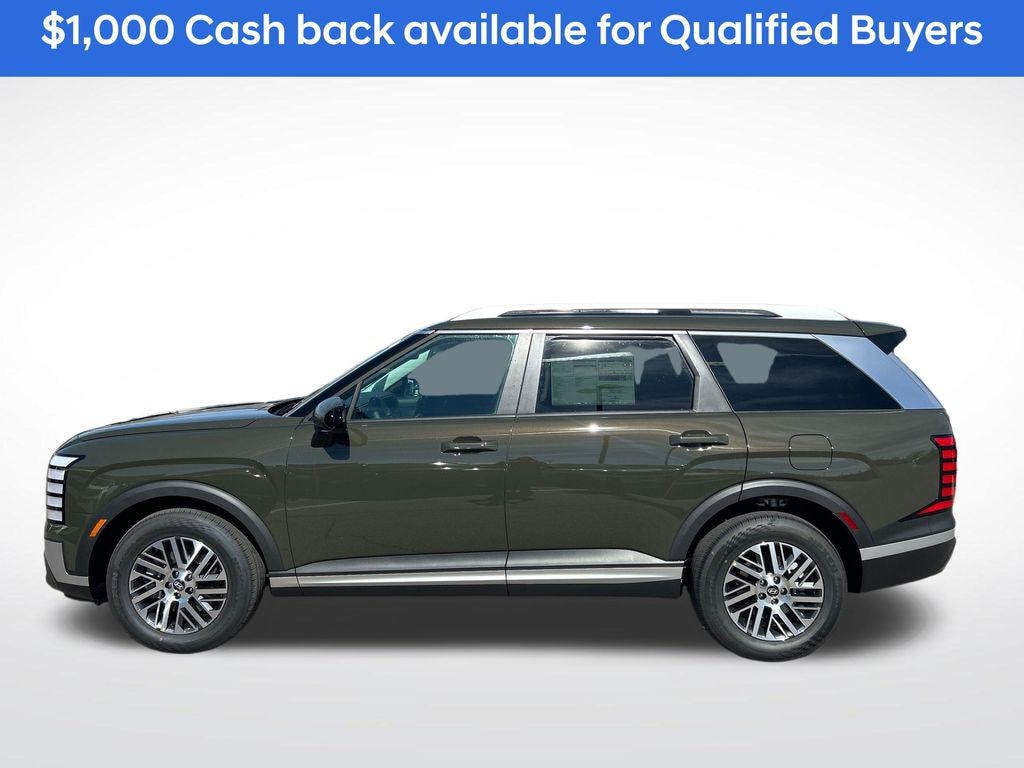 Titan Green 2026 Hyundai Palisade SEL 7 Passenger AWD 8-Speed Automatic V6 Price includes the following incentives, not all customers will qualify. See dealer for details. : $1000 - Hyundai HMF Dealer Choice: $1000 discount and 5.39% APR for 24 months. $44.05 per $1000 financed. Available to well qualified buyers who finance through Hyundai Motor Finance. H704. Exp. 04/30/2026